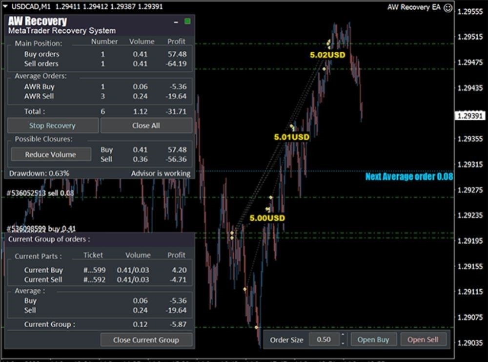 AW Recovery EA is a trading tool employed for recovering losing positions. The software algorithm freezes a losing trade, splits it into numerous tiny fragments, and exits each fragment individually in an attempt to restrict losses and enhance general account performance.