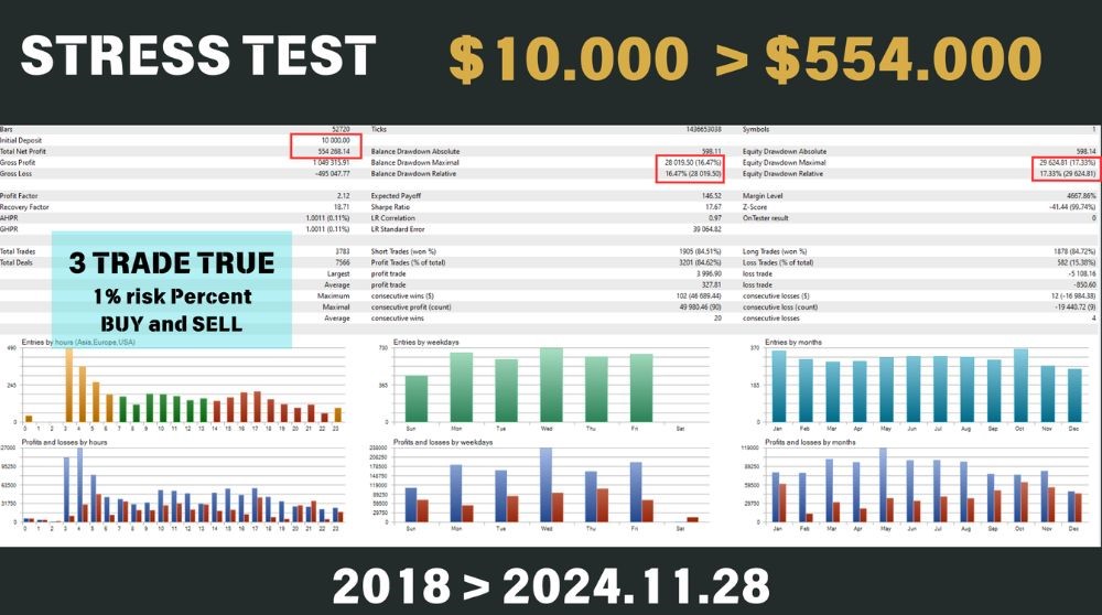 Bitcoin Scalping MT4 has been tested extensively from 2018 to November 2024, displaying sustained performance during various market conditions. Utilizing its BUY & SELL strategy, the EA proves to be long-term profitable.