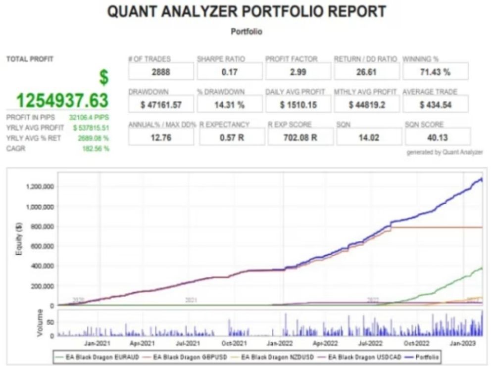BLACK DRAGON EA Expert Advisor performs excellently, generating over $1.25 million in total profit on EURAUD, GBPUSD, NZDUSD, and USDCAD. It has a 182.56% CAGR, engineered for growth-oriented capital gain with robust risk-adjusted returns.